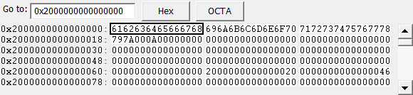 On the right side of the window is a scrollbar. You can use it to scroll up and down in the displayed memory region. When the scrollbar reaches the bottom of the window, you still can continue to scroll down by using the page down button of the scroll bar. The same is true when you reach the top of the window with the restriction, that you can not scroll past the address given in the top left edit window.