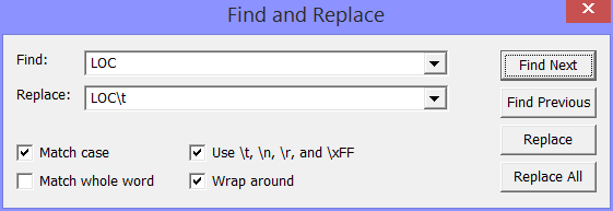 Non printing characters are difficult or impossible to enter as part of a search or replacement string. For instance you can not type a TAB character in the `Find´ edit box, because when you hit the TAB key, the cursor will just leave the edit box and jump to the next user interface item. To make it possible to enter and see these special characters, the backslash character can be used as an escape character.