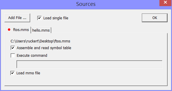In a typical MMIX setting, the complete MMIX program is contained in a single source file. If this box is checked, the check boxes below will be set automatically in such a way, that only one source file will be assembled and loaded. If this box is unchecked you are free to assemble and load as many files you want (even none at all). You should then know what you do. Note that programs are loaded into memory using the XOR operation.